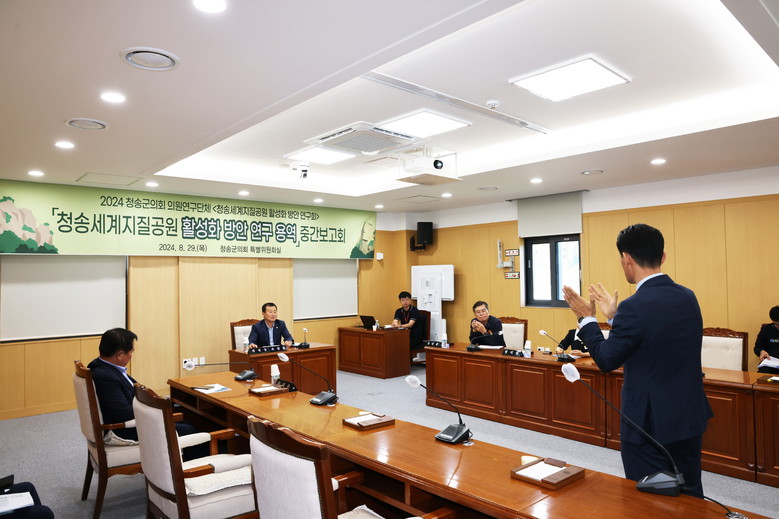 [청송군 세계타임즈=한윤석 기자] 청송군의회 의원연구단체 '청송세계지질공원 활성화 방안 연구회'는 29일 청송군의회 특별위원회실에서 「청송세계지질공원 활성화 방안 연구 용역」 중간보고회를 개최했다.