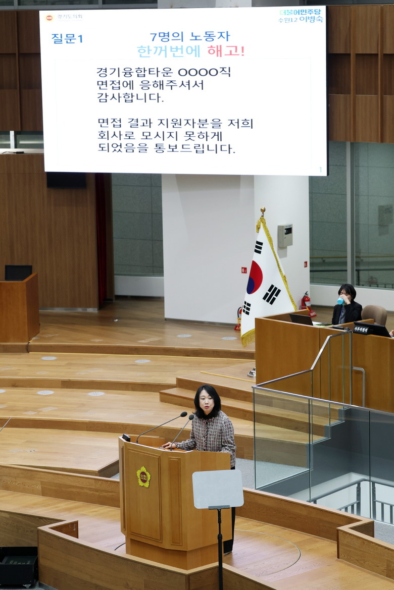 두 번째로 이병숙 의원은 최근 발생한 경기융합타운 공용공간 용역 노동자 7명의 집단해고 사태를 강도 높게 비판했다. 이 의원은 2025년 말, 새해를 앞둔 시점에서 숙련 노동자들이 문자 한 통으로 해고된 사실을 공개하며, 이것이 명백히 ‘기획된 해고’임을 주장했다.