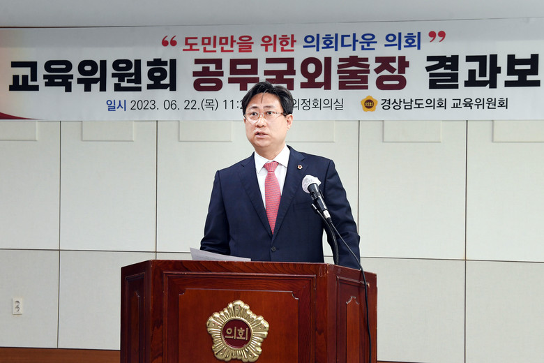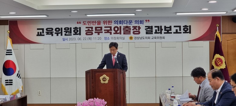 [경남 세계타임즈=최성룡 기자] 도의회 교육위원회는 22일, 도의회 의정회의실에서 ‘2023년 공무국외출장 결과보고회'를 열었다.