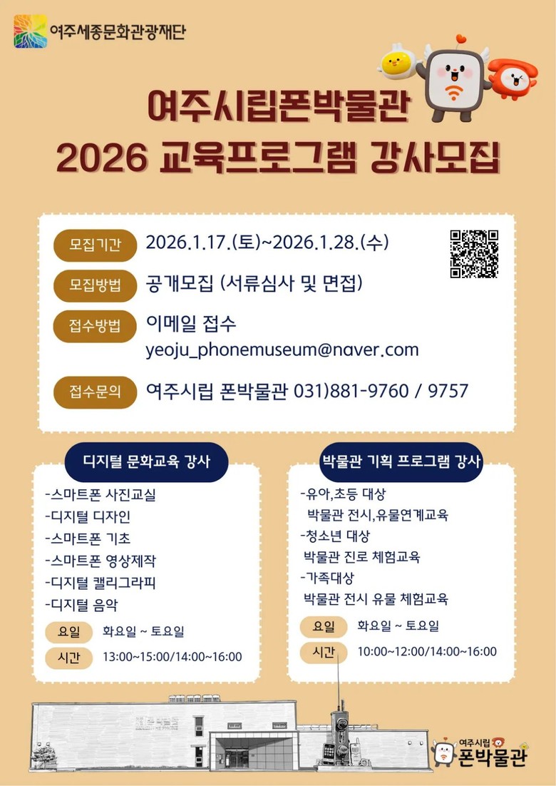 이번 모집은 급변하는 디지털 환경 속에서 시민들의 디지털 역량을 강화하고, 박물관 전시와 유물을 활용한 체험 중심 교육을 활성화하기 위해 마련됐다. 선발된 강사는 2026년 3월부터 2027년 2월까지 여주시립 폰박물관에서 다양한 교육 프로그램을 운영한다.