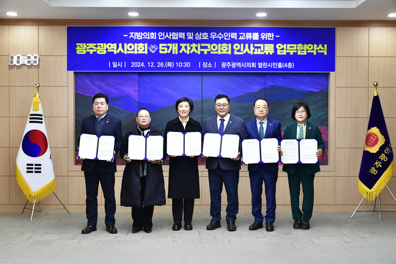 [광주 세계타임즈=손권일 기자] 광주광역시의회(의장 신수정)와 5개 자치구의회(자치구의회의장협의회 대표회장 김명수)가 26일 시의회 열린시민홀에서 인사교류 업무협약을 체결했다.