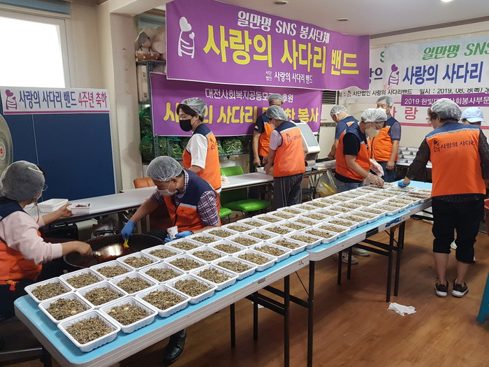 [대전=세계타임즈 이채봉 기자] 대전광역시 SNS 일만명 봉사단체 사랑의 사다리 밴드(리더 이정제)는 8일 오전9시~오후1시에 대덕구 중리동에 위치한 사랑의 사다리 밴드 사무실에서 밑반찬을 만들어서 서구 소외계층 52가정에 전달을 하였다.