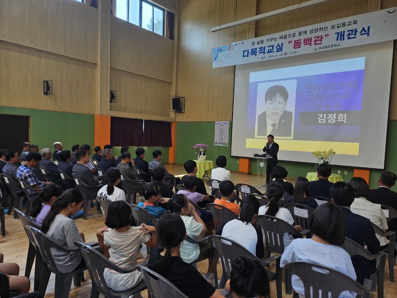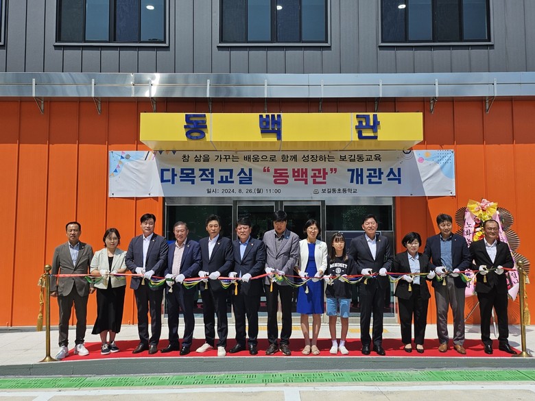 김정희 교육위원장은 축사를 통해 “도서지역 학교의 다목적교실은 단순히 강당의 기능을 넘어, 지역사회의 구심점 역할을 하고 있다.”며 “동백관은 학생들이 건강하게 성장할 수 있도록 도울 것이고, 지역민의 화합에도 크게 기여할 것으로 믿어 의심치 않는다.”고 말했다.