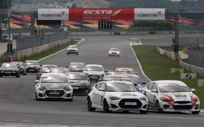 [사진설명] 코리아인터내셔널서킷에서 열린 2018 엑스타 슈퍼챌린지 3라운드 슈퍼 200과 슈퍼 TGDI의 혼합 결승전에 참가한 차량들이 힘차게 스타트하고 있다.