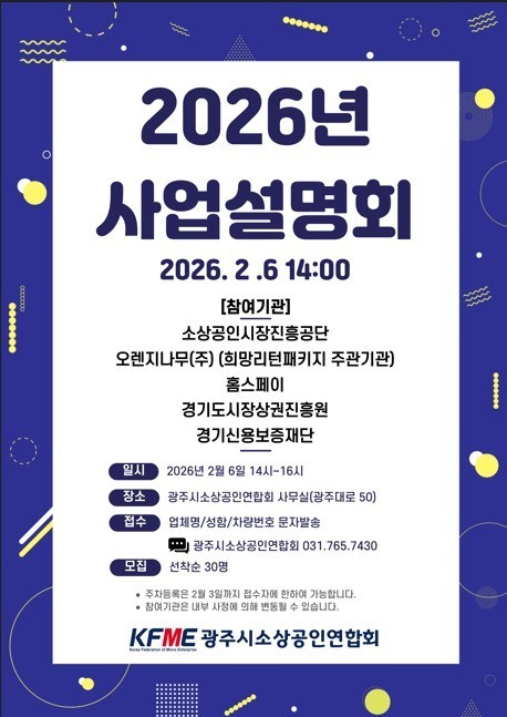 설명회는 오는 6일 오후 2시부터 4시까지 광주시소상공인연합회 사무실(광주대로 50)에서 열린다. 이날 행사에는 소상공인시장진흥공단, 홈스페이, 경기신용보증재단, 경기도시장상권진흥원이 참여해 기관별 2026년도 지원정책과 주요 사업을 설명할 예정이다. 참석자들은 정책 자금, 경영 개선 지원사업 등 분야별 정보를 한 자리에서 확인할 수 있다.
