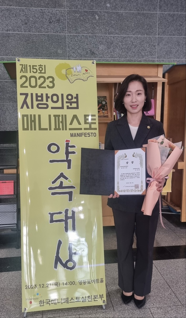 [강원도 세계타임즈=김민석 기자] 이지영 강원특별자치도의원(더불어민주당, 비례)은 21일 한국매니페스토실천본부가 주최한 ‘2023 지방의원 매니페스토 약속대상’ 좋은 조례 분야에서 최우수상을 수상했다.