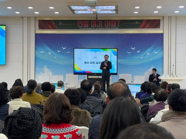 28일 신천지 정읍교회에서 열린 ‘연말 여기 어때’에서 강연하고 있는 이용우 담임 강사