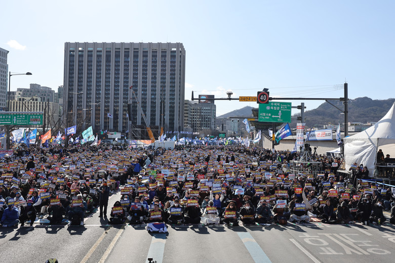 [세계타임즈 = 심귀영 기자] 29일 서울 종로구 동십자각 인근에서 더불어민주당 박찬대 원내대표, 조국혁신당 김선민 대표 권한대행 참석하에 열린 야5당 대통령 탄핵 촉구 사전집회에서 참가자들이 구호를 외치고 있다. 2025.3.29