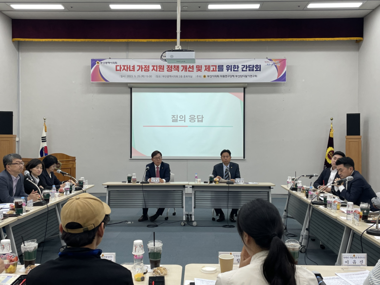 [부산 세계타임즈=이용우 기자] 부산광역시의회 의원연구단체인 ‘부단연(부산단디알기연구회, 대표 성현달 의원(남구3, 국민의힘))’이 주최하는 「다자녀 가정 지원 정책 개선 및 제고를 위한 간담회」가 5월 25일(목) 15시 부산시의회 2층 중회의실에서 개최되었다.