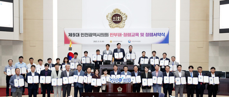 인천시의회는 최근 본회의장에서 청렴 문화 확산과 반부패 의지 함양을 위한 ‘2023년도 반부패·청렴 교육 및 청렴 서약식’을 개최했다고 6일 밝혔다.