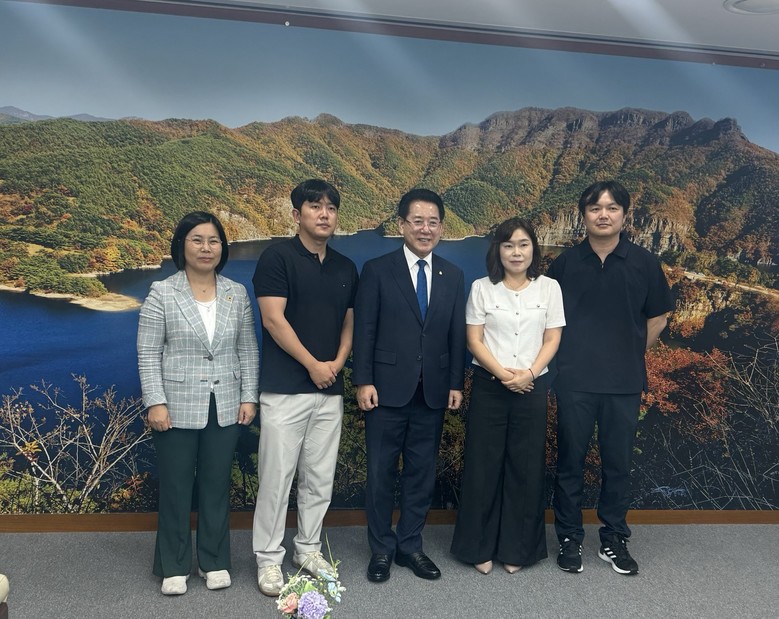 | ▲ 박경미 전남도의원(더불어민주당, 광양4), 황순원 광양·순천·나주·여수시 전세사기피해자 대표, 김영록 전남지사, 이복길·최기열 신원아르시스 입주민. 사진=광양 신원아르시스 비상대책위원회 제공 |