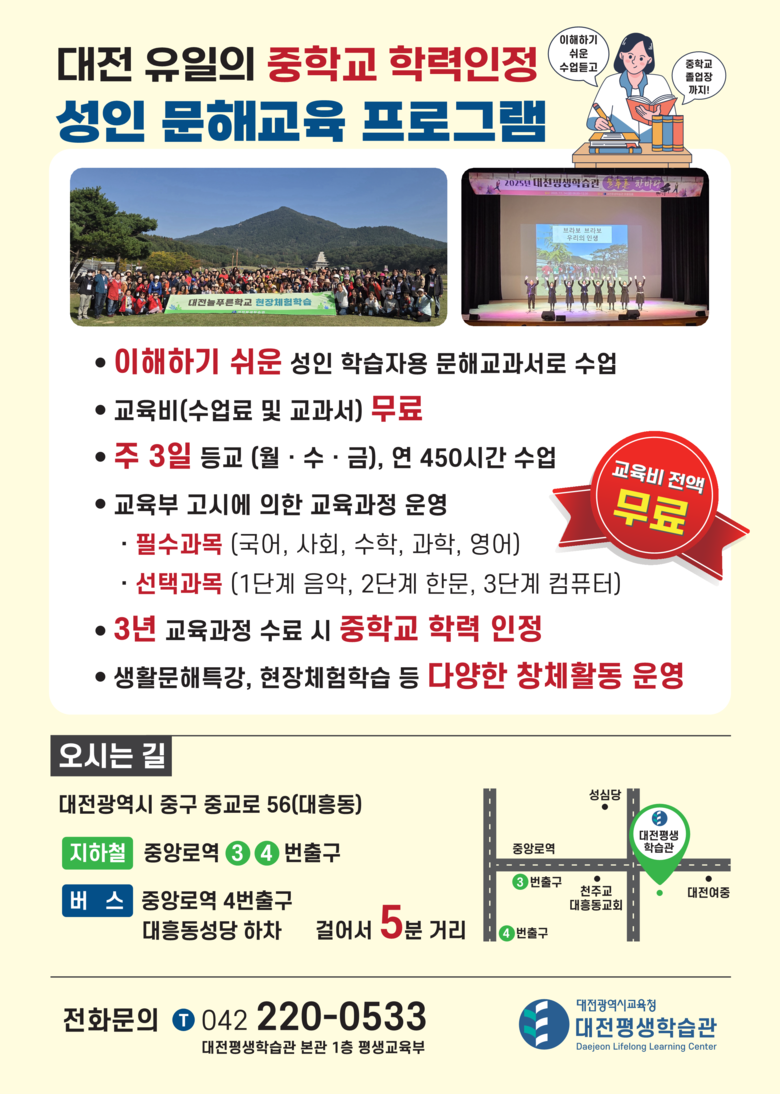 교육비는 전액 무료이며, 입학 희망자는 대전평생학습관 1층 평생교육부에 직접 방문하여 초등학교 졸업 관련 증명서와 함께 입학원서를 제출하면 된다. 기타 자세한 사항은 대전평생학습관 홈페이지를 참고하거나 평생교육부(☎042-220-0533)로 문의하면 안내받을 수 있다.