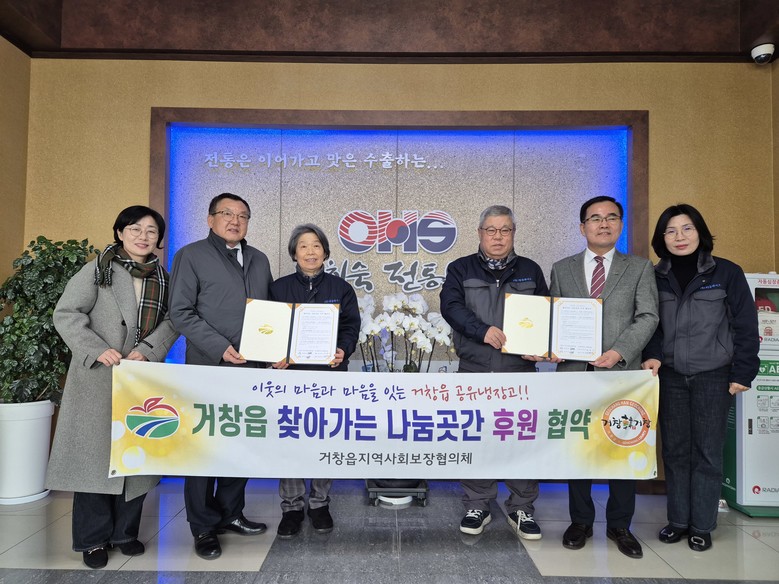 [거창군 세계타임즈=최성룡 기자] 거창군 거창읍 지역사회보장협의체(공동위원장 류현복, 정기석)는 27일 남상면에 위치한 부각 명가 오희숙전통부각 본사에서 ㈜하늘바이오 농업회사법인(대표 윤효미)과 거창읍 공유냉장고 ‘찾아가는 나눔곳간’ 후원 및 지역사회 나눔문화 확산을 위한 협약을 체결했다.