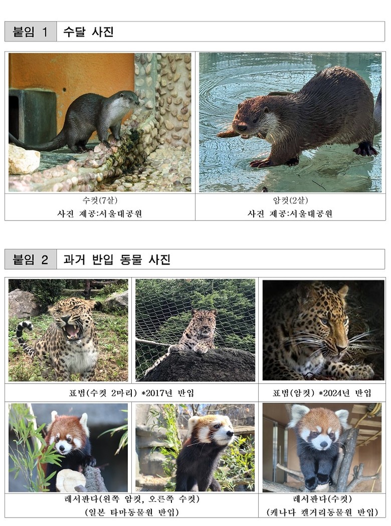 이번 수달 기증은 2023년 5월 16일 서울대공원과 일본 타마동물원이 체결한 “국제적 멸종위기종 보전을 위한 동물상호기증” 협약에 따른 것이다. 양 기관은 협약에 따라 수달과 레서판다를 상호 교류하기로 했으며, 서울대공원은 2023년 11월 일본 타마동물원으로부터 레서판다 한 쌍을 우선 반입한 바 있다.