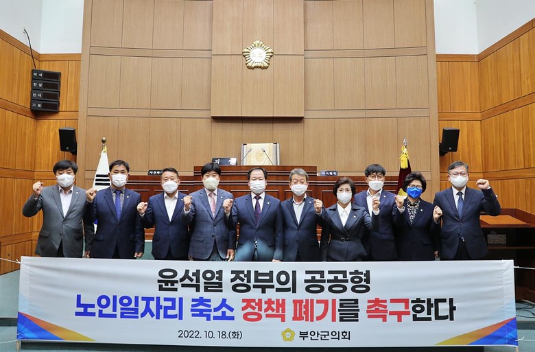 정부가 2023년도 예산안 중 저소득층 고령 어르신들을 위한 공익활동형 노인일자리 예산을 감축하여, 공익형 노인일자리 사업이 10%정도 축소될 위기가 예상되는 가운데, 부안군의회에서 채택한 결의안은 “공공형 노인일자리 축소 정책은 복지 사각지대에 있는 생계가 어려운 저소득층 노인들에게 큰 타격이 예상된다.”며 어르신들의 생계를 위협하는 공공형 노인일자리사업 축소 정책의 폐기, 공공형 노인일자리를 공익적 가치가 높은 일자리사업으로 개편, 취업이 힘든 고령자분들께는 공공형 일자리를 지속적으로 제공할 것을 촉구하는 결의안을 정부와 국회에 제출하였다.