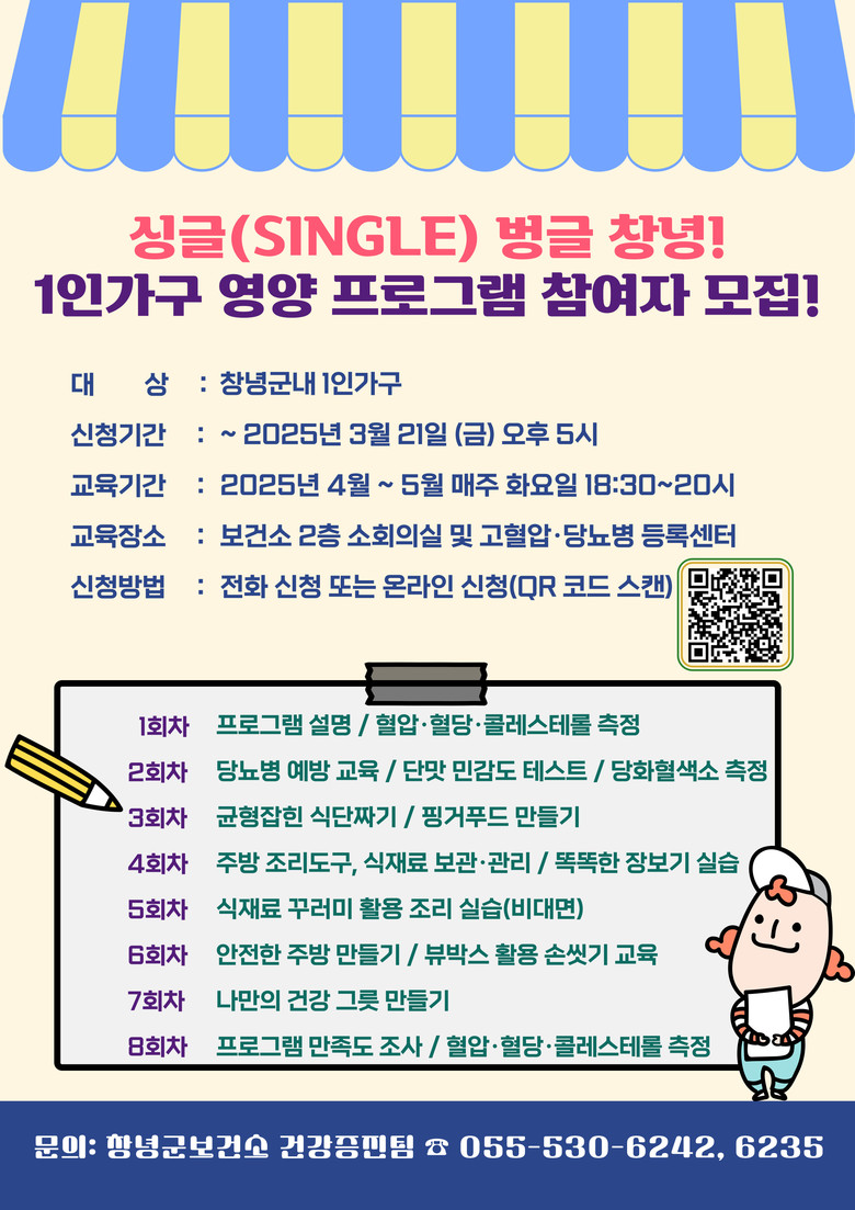 신청 기간은 2월 28일부터 3월 21일까지이며, 전화 또는 온라인으로 신청할 수 있다. 자세한 사항은 창녕군보건소 건강증진팀(☎ 055-530-6242, 6235)으로 문의하면 영양사의 상담도 받을 수 있다.