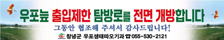 군은 AI 확산 방지를 위해 지난달 15일부터 우포늪 탐방로 출입을 제한했으나, 6주 이상 추가 발생이 없고, 고병원성 AI 발생 예찰 지역 내 가축 이동제한이 해제된 점을 고려해 출입제한을 해제하기로 결정했다.