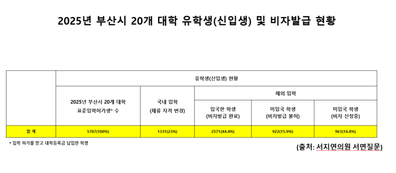 서지연 의원이 부산 소재 20개 대학 중 주요 대학을 대상으로 처음 실시한 조사에 따르면, 2025년 부산 대학에 등록금을 납부한 외국인 유학생은 총 5,787명이나, 실제 학기 참여율은 약 44%에 불과한 것으로 나타났다.