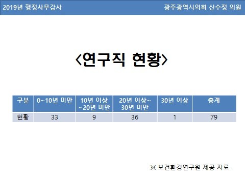 보건환경연구원에서 제출한 ‘보건환경연구원 연구직 현황’에 따르면 보건환경연구원 근무자는 79명이다.