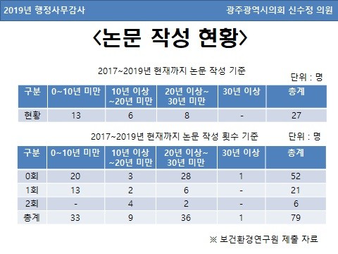 신수정의원이 ‘보건환경연구원 연구직 논문 작성 현황’ 자료를 분석한 결과, 지난 3년간 27명의 연구직이 논문 제1저자로 이름을 올렸다. 이중 10년 미만 근무자 중 13명, 10년 이상 20년 미만 근무자는 6명, 20년 이상 30년 미만 근무자는 8명, 30이상 근무자는 없는 것으로 나타났다.