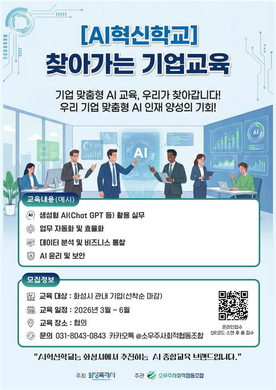 교육 접수 및 문의는 화성특례시청 AI스마트전략실(031-5189-1757)로 하거나, 안내 포스터 내 QR코드를 통해 신청할 수 있다.