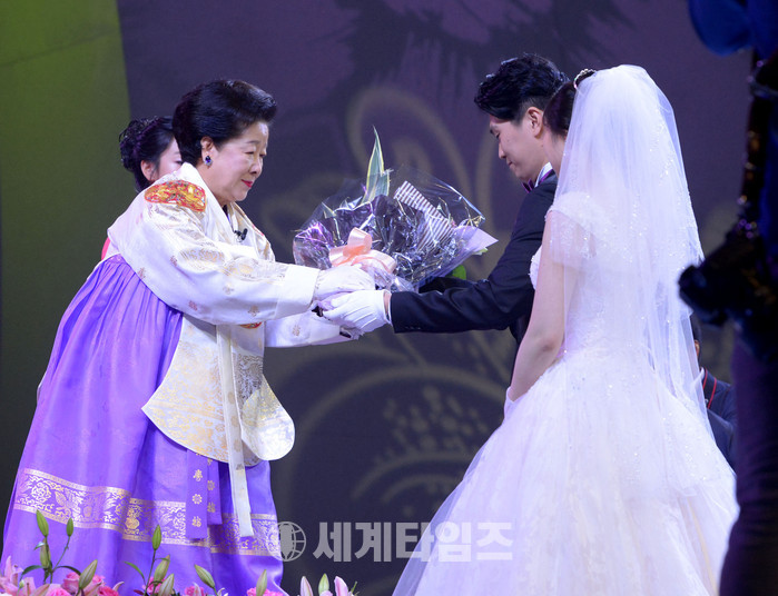왼쪽은 꽃을 받는 한학자 총재. 이날 미국, 영국, 독일, 이탈리아, 일본, 호주, 싱가포르, 필리핀, 네팔, 러시아, 아르헨티나, 콜롬비아, 요르단, 수단, 남아프리카공화국 등 64개국 4000여쌍과 인터넷 생중계를 통해 194개국에서 동참한 2만여쌍 등 모두 2만 4000여쌍의 신랑신부가 동시에 식을 올렸다. 2017.09.07.
