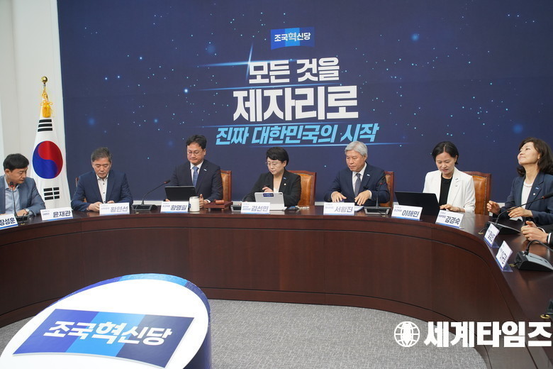 '조국혁신당' 의원들이 26일 서울 여의도국회의사당에서 열린 최고위원회의를 하고있다.