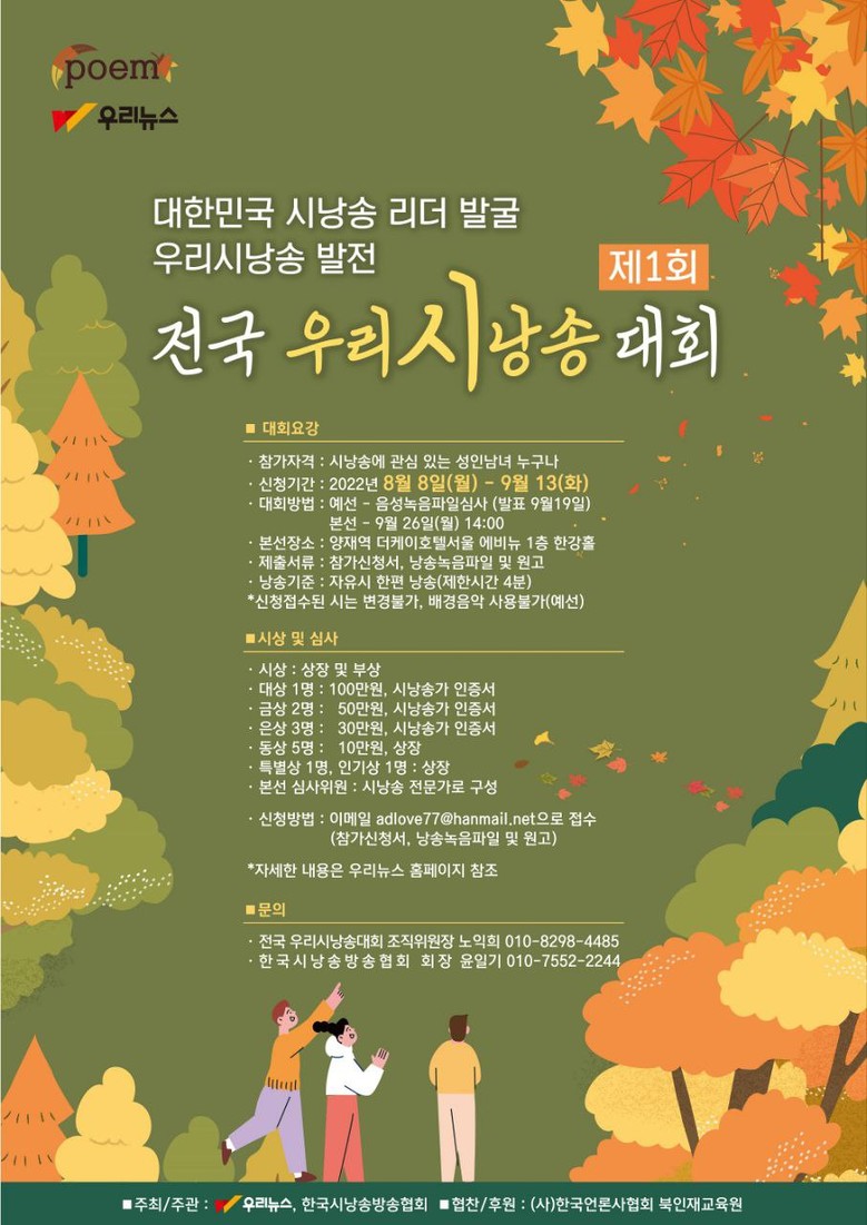 참가 자격은 전국 대회 수상자를 포함한 시낭송 애호가들이며 2인 이내 합송도 가능하다. 예선 접수는 8월 8일부터 9월 13일이며, 4분 이내의 녹음 파일과 신청서를 작성해 이메일로 제출하면 된다.