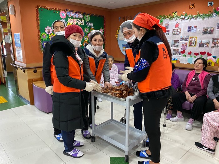 이날 통닭봉사에는 추운날씨에도 신상일 단장을 비롯해서 회원15명이 2층~6층에 계시는 요양원 어르신들에게 바비큐 통닭을 전달 하였다.