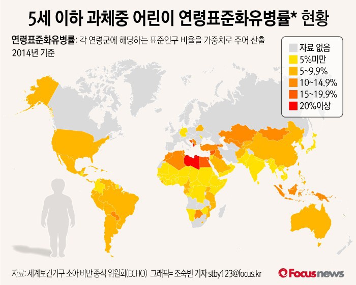 (서울=포커스뉴스) 25일(현지시간) 세계보건기구(WHO) 소아 비만 종식 위원회(ECHO)가 발표한 자료에 따르면 지난 2년간 5세 이하 어린이들의 비만율이 높아져 최소 4100만명의 어린이들이 과체중 또는 비만이라는 지적이 제기됐다. 소아 비만 증가 현상은 특히 저소득, 증산층 국가에서 두드러졌다.