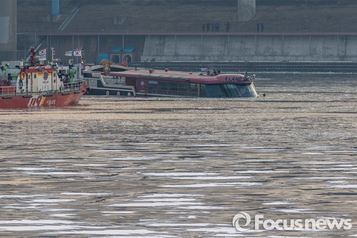 (서울=포커스뉴스) 26일 오후 서울 한강 영동대교 인근을 지나던 한강유람선이 침수, 구조대원들이 구조활동과 견인 작업을 하고 있다.
