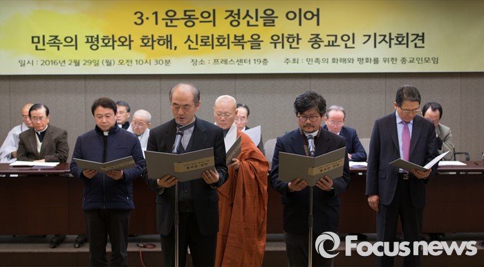 (서울=포커스뉴스) 29일 오후 서울 중구 프레스센터에서 '3.1 운동의 정신을 이어 민족의 평화와 화해, 신뢰회복을 위한 종교인 기자회견'에 참석한 종교인들이 성명서를 낭독하고 있다. 왼쪽부터 천주교 이영우 신부, 원불교 김현국 교무, 지홍 스님, 김현호 신부, 전병금 목사.