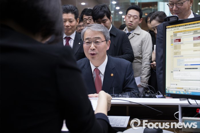 (서울=포커스뉴스) 15일 오후 서울 여의도 신한금융투자 본사 영업점에서 임종룡 금융위원장이 개인종합자산관리계좌(ISA)를 가입하고 있다.