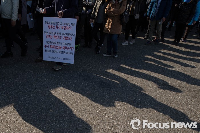 (파주=포커스뉴스) 16일 오후 경기도 파주시 통일대교에서 개성공단 입주기업, 영업기업, 협력기업 등 대표를 비롯한 임직원과 가족들이 공단재가동 및 실질보상을 촉구하며 '개성공단 평화대행진'을 하고 있다.