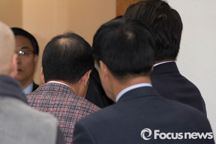 (서울=포커스뉴스) 18일 오전 서울 서초구 서울중앙지방법원에서 고(故) 성완종 전 경남기업 회장으로부터 불법 정치자금을 받은 혐의로 기소된 홍준표(62) 경남도지사가 4차 공판에 출석하고 있다.