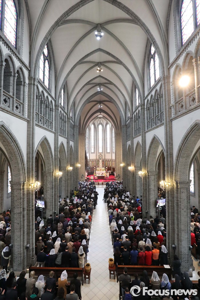 (서울=포커스뉴스) 부활절을 맞아 27일 정오 서울 중구 명동성당에서 열린 '예수 부활 대축일 미사'에 신도들이 참석해 기도하고 있다.