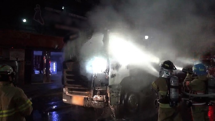 경찰과 소방당국은 운전석쪽 전조등 쪽에서 불이 시작된 것으로 보고 정확한 원인을 조사중이다.28일 오전 4시 53분쯤 서울 동대문구 답십리동 도로변에 정차 중이던 덤프트럭에서 불이 나 소방관들이 불을 끄고 있다. (사진제공=서울 동대문소방서)