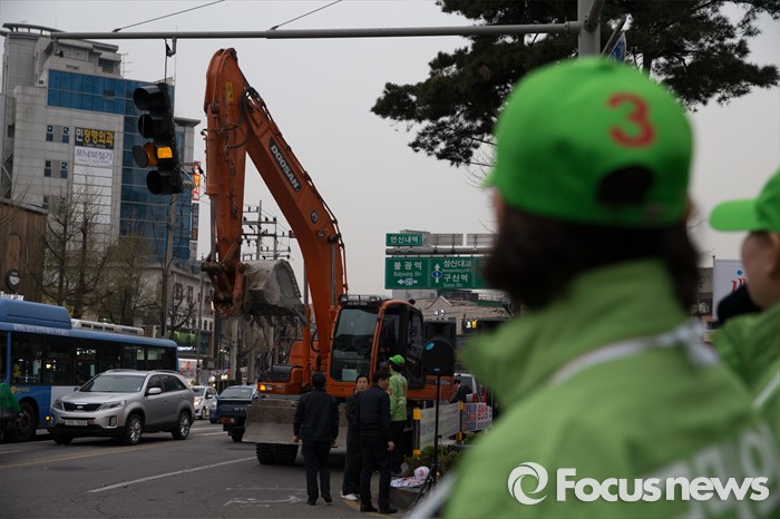 (서울=포커스뉴스) 6일 오후 서울 은평구 연신내 물빛공원에서 고연호 국민의당 은평구을 후보의 유세가 끝나고 철수하는 포크레인이 신호등을 건드려 망가졌다.