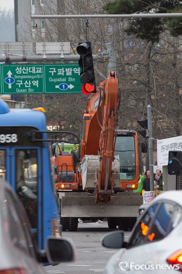 (서울=포커스뉴스) 6일 오후 서울 은평구 연신내 물빛공원에서 고연호 국민의당 은평구을 후보의 유세가 끝나고 철수하던 포크레인이 신호등을 건드려 망가졌다.