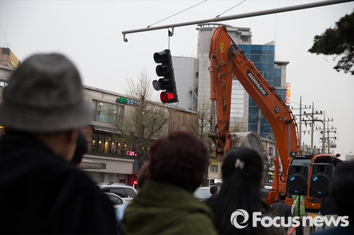 (서울=포커스뉴스) 6일 오후 서울 은평구 연신내 물빛공원에서 고연호 국민의당 은평구을 후보의 유세가 끝나고 철수하던 포크레인이 신호등을 건드려 망가졌다.