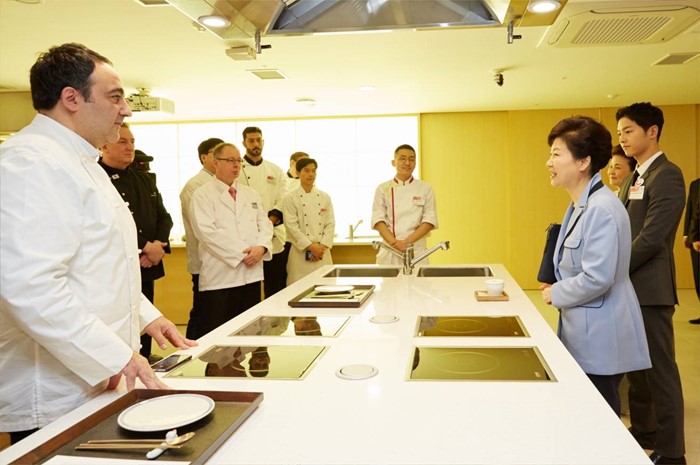 (서울=포커스뉴스) 박근혜 대통령은 11일 오전 서울 중구 한국관광공사 서울센터에서 열린 K-스타일 허브(K-Style Hub) 한식문화관 개소식에서 배우 송중기 및 윤숙자 한식재단 이사장 등과 함께 전시관들을 둘러보고 있다. <사진출처=청와대>