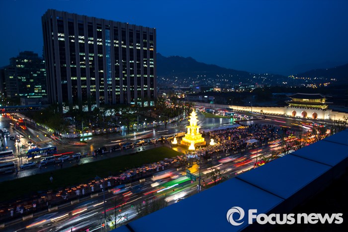 (서울=포커스뉴스) 20일 오후 서울 종로구 광화문 광장에서 부처님오신날(5월 14일)을 앞두고 봉축행사의 일환인 '사사자 삼층석탑등 점등식'이 열리고 있다.