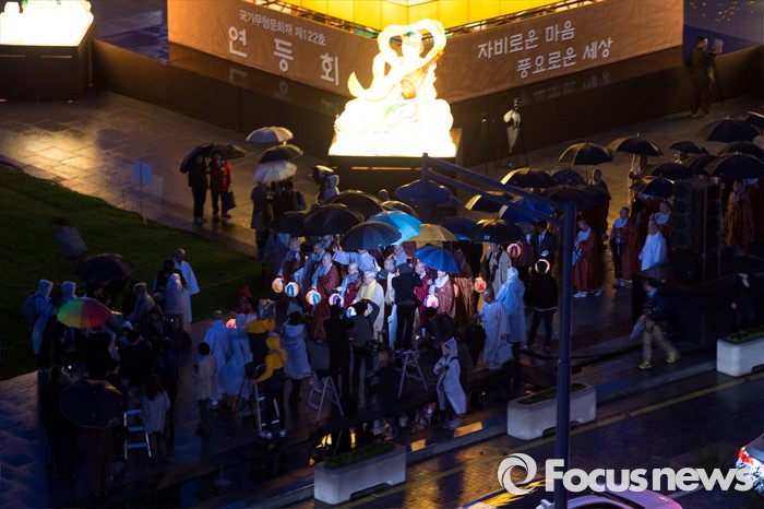 (서울=포커스뉴스) 자승 대한불교조계종 총무원장이 20일 오후 서울 종로구 광화문 광장에서 열린 '사사자 삼층석탑등 점등식'에 참석해 불자들과 등을 들고 탑 주위를 돌고 있다.