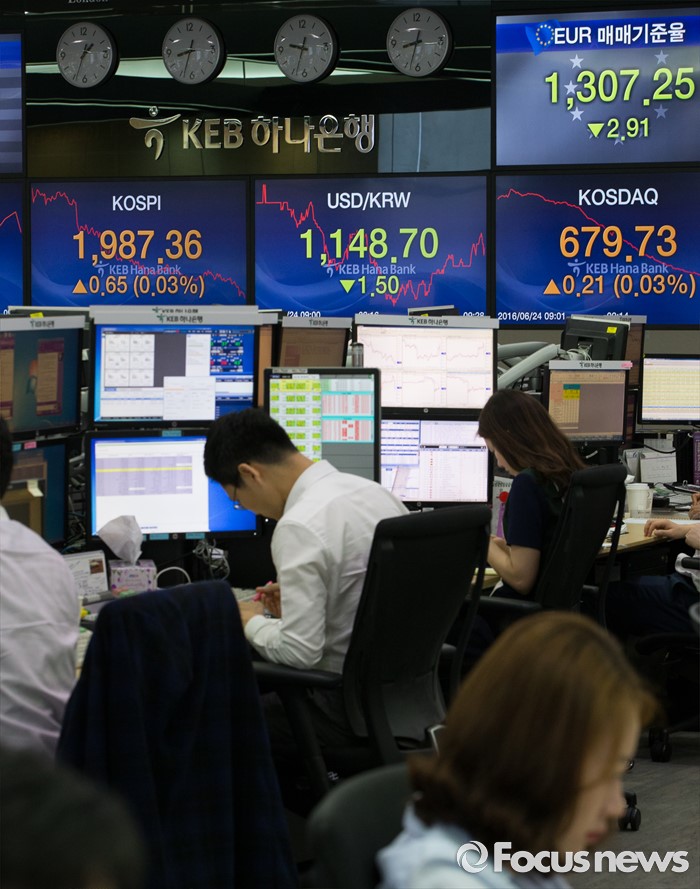 (서울=포커스뉴스) 영국의 유럽연합(EU) 탈퇴를 의미하는 '브렉시트' 국민 투표 개표가 진행되는 24일 오전 서울 중구 KEB 하나은행 명동 본점 딜링룸에서 딜러들이 업무를 보고 있다. 이날 코스피지수는 브리메인 기대에 2000p를 돌파했으나 다시 하락해 1900p대를 유지하고 있다.