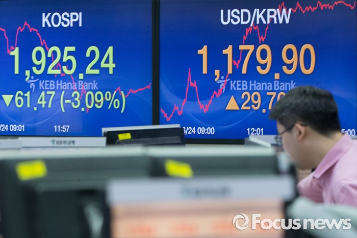 (서울=포커스뉴스) 영국의 유럽연합(EU) 탈퇴를 의미하는 '브렉시트'가 확정된 가운데 24일 오후 서울 중구 KEB 하나은행 명동 본점 딜링룸에서 딜러들이 업무를 보고 있다. 이날 코스피는 전날 대비 61.47p(3.09%) 내린 1,925.24, 코스닥은 32.36p(4.76%) 내린 647.16, 환율은 29.7원 오른 1,179.9원을 기록하며 장을 마감했다.