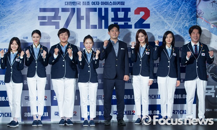 (서울-포커스뉴스) 6일 오전 서울 중구 동대문 메가박스에서 열린 영화 '국가대표2' 제작보고회에 참석한 출연진이 포토타임을 갖고 있다. 왼쪽부터 배우 진지희, 김예원, 하재숙, 김슬기, 김종현 감독, 오연서, 수애, 오달수.