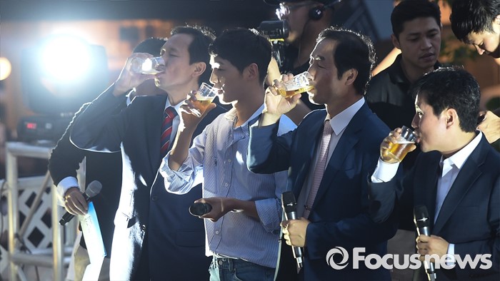 (서울=포커스뉴스) 14일 오후 서울 서대문구 신촌 일대에서 열린'제2회 신촌맥주축제'에 참석한 배우 송중기를 비롯한 참석자들이 건배하고 있다. 왼쪽부터 개그맨 양세호, 우상호 더불어민주당 원내대표, 배우 송중기, 문석진 서대문구청장.