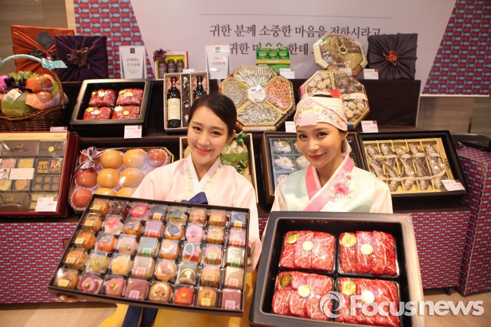 남기대 롯데백화점 식품부문장은 “매해 명절 선물세트를 미리 준비하려는 소비자들이 늘면서 올해 추석에는 사전예약판매 시작을 지난해보다 3일 앞당기고 기간도 늘렸다”며 “예약판매 기간을 활용하면 선물을 합리적인 가격으로 편리하게 구매할 수 있을 것“이라고 말했다.롯데백화점 본점에서 모델들이 설 선물세트를 선보이고 있다.<사진제공=롯데백화점> 2016.01.10 이서우 기자