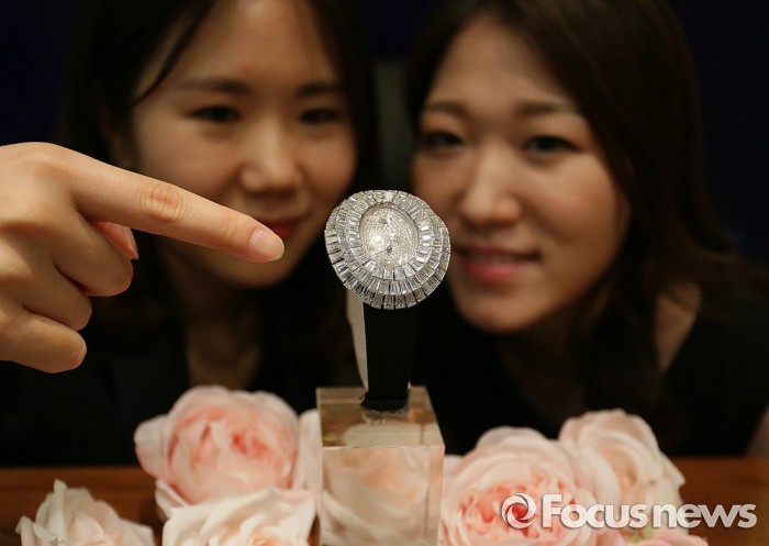 총 38캐럿이 넘는 다이아몬드 세팅으로 만개하는 꽃을 형상화한 크레이지 플라워 시계와 함께 올해 스위스 바젤월드 2016을 통해 선보인 펄 임페리얼 시계를 선보인다.24일 압구정 갤러리아명품관 매장에서 모델이 선보이고 있는 제품은 스위스 브랜드 브레게의 ‘크레이지 플라워 하이주얼리 워치’다. 140개의 바게트컷 다이아몬드와 272개의 브릴리언트컷 다이아몬드가 세팅돼 있다. 판매가는 약 8억5000만원이다.