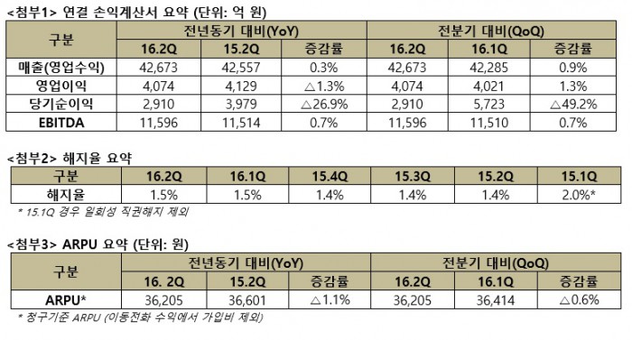 매출은 가입비 폐지 및 선택약정할인 가입자 증가 등의 감소 요인에도 불구, SK브로드밴드 등 자회사의 매출 증가에 힘입어 전년 동기 대비 0.3% 증가한 4조2673억 원을 기록했다.